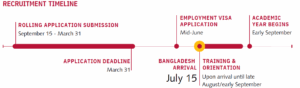 AUW will purchase all airline tickets. Fellows should work with AUW to identify appropriate flights to and from their homes. Fellows should arrive in Chittagong by July 15, 2026. Fellows will obtain their own employment visas, working with AUW to provide the needed documentation. For visas Fellows will need a letter from Bangladesh authorities, and an invitation letter from the university. Fellows will be reimbursed the cost of the visa when they arrive in Chittagong.